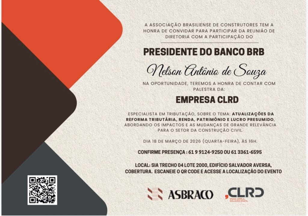 O evento contará com a presença do Presidente do Banco BRB, Nelson de Souza, fortalecendo o diálogo entre o setor da construção civil, o sistema financeiro e os profissionais da área contábil.