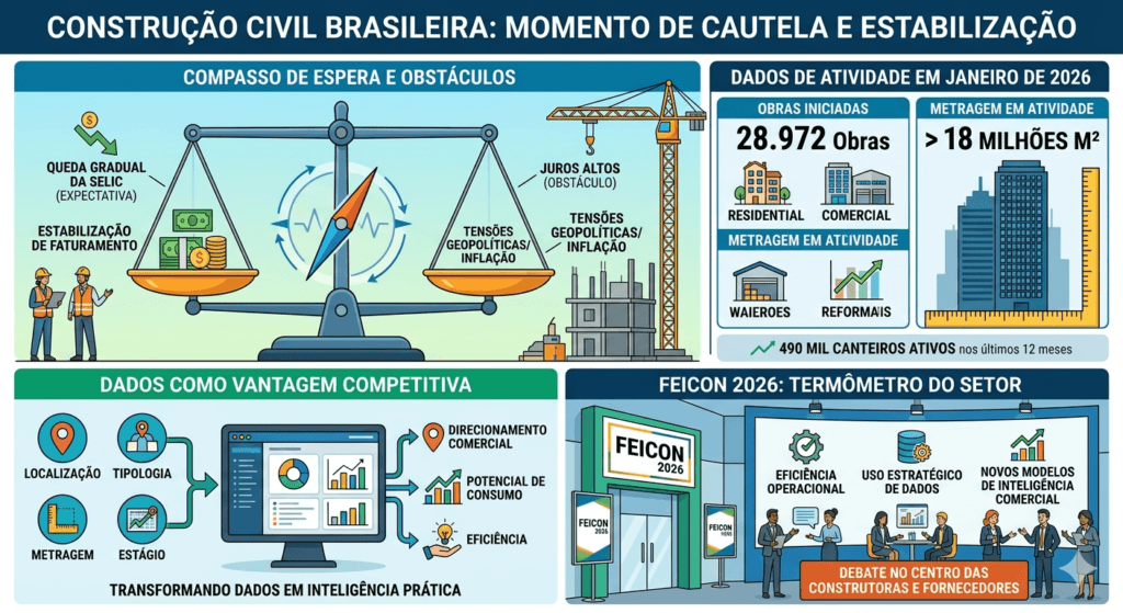 O setor da construção civil brasileiro atravessa um momento de cautela. Os primeiros meses de 2026 revelam um mercado em processo de acomodação — nem em queda livre, nem em recuperação plena — enquanto a taxa básica de juros em patamar elevado continua a frear novos investimentos e tornar o crédito inacessível para boa parte dos projetos.