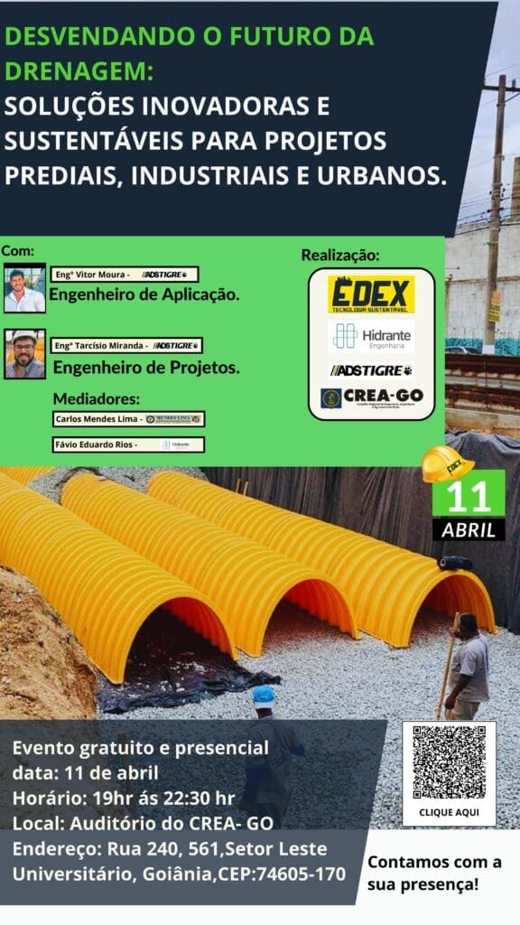 Este evento é gratuito e ocorrerá presencialmente no dia 11 de abril, das 19h às 22h30, no Auditório do CREA-GO, localizado na Rua 240, 561, Setor Leste Universitário, Goiânia, CEP: 74605-170. Sua presença é fundamental para enriquecer o debate e promover o avanço das práticas de drenagem em nossas comunidades. Contamos com você!