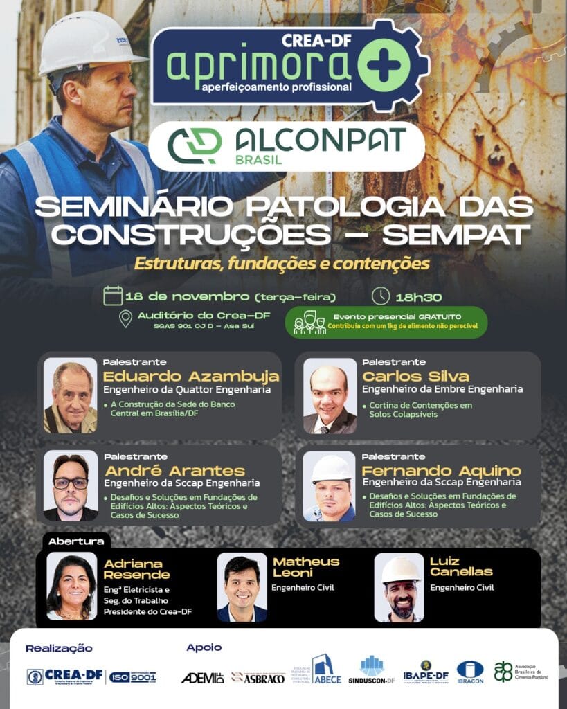 No dia 18 de novembro (terça-feira), o CREA-DF, em parceria com a Alconpat Brasil, realiza o Seminário Patologia das Construções – SEMPAT, com o tema “Estruturas, Fundações e Contenções”.
